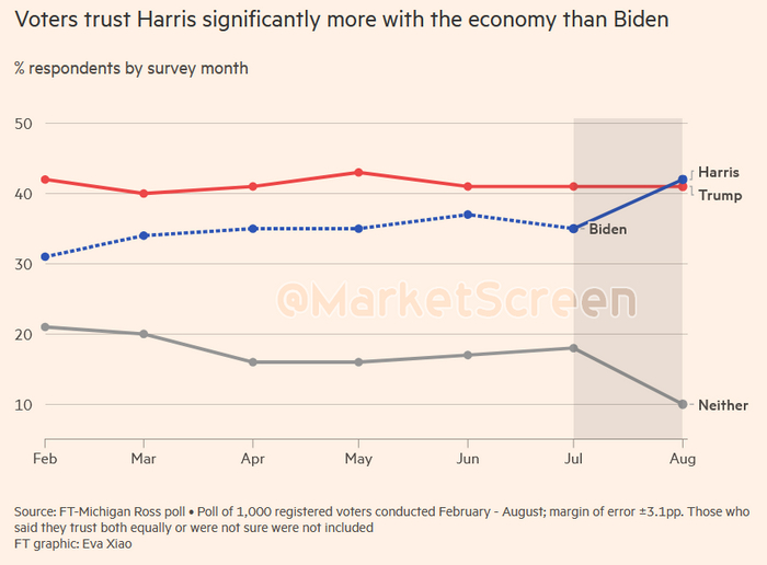 Финансовые Врема опираясь на опросы, сообщают, после выхода Джозефа Джозефовича из предвыборной гонки, настроения избирателей резко изменилось. Теперь бОльшее число американцев доверяют Камале Харрис в управлении экономикой США, чем российскому агенту Донни.