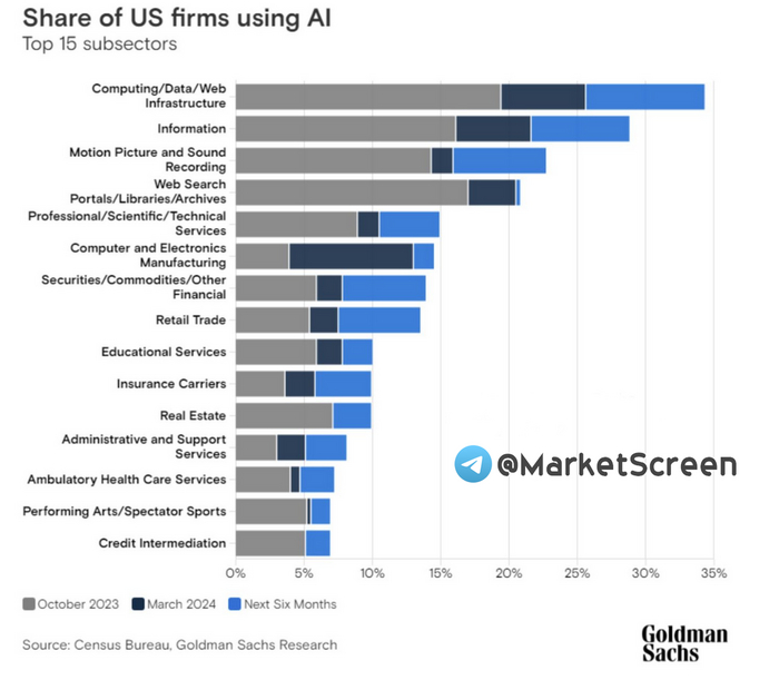 Тут ГолдманСаки нарисовали инфографику, где мы видим распространённость ИИ в различных секторах реальной экономики.