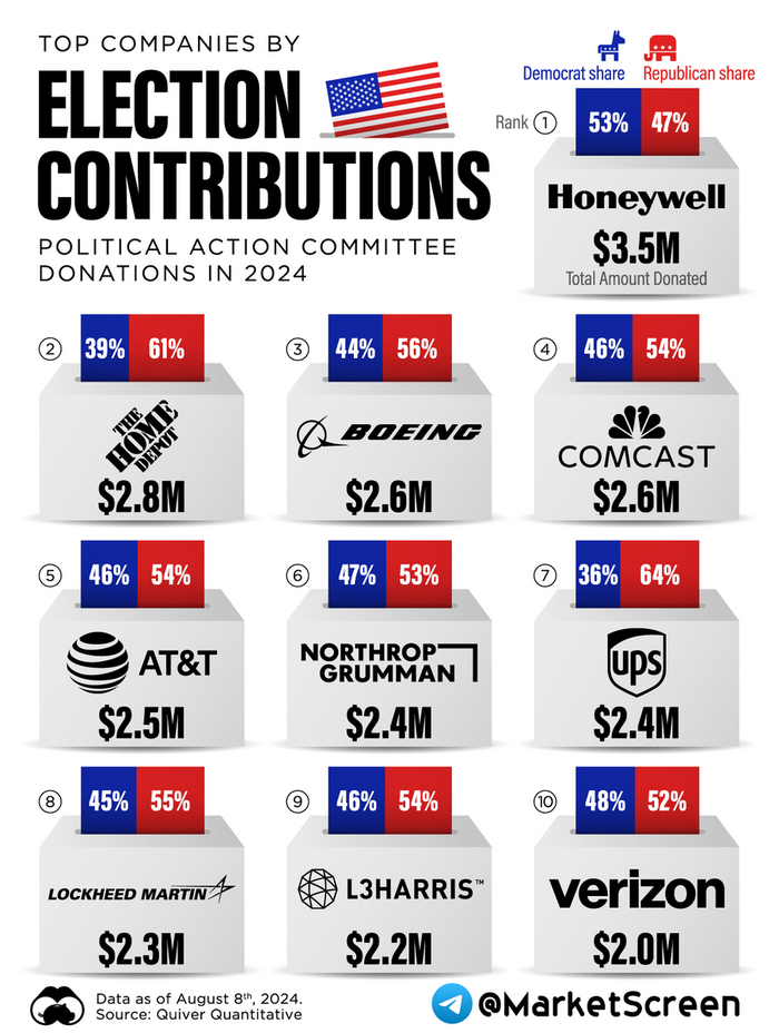 В этот раз республиканцы получили чуть больше. Единственные, у кого донаты синеньким превысили сумму донатов красненьким, стала Honeywell.