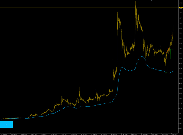 Это дневной график. И на нём VWAP, рассчитанный от лоёв 2020 года. Он несколько раз сдерживал падение цены. 3 июня сего года цена снова в него ударила и пошла вверх. Это однозначный вход для инвесторов в лонги. В которых инвестор до сих пор бы сидел со стопом в безубытке на 71,64.