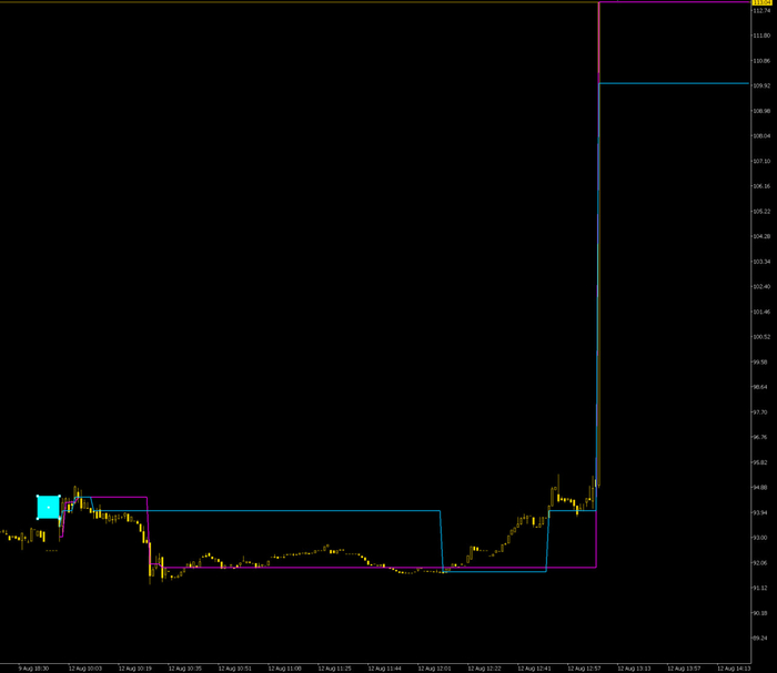 Это если бы мы сию акцию торговали внутри дня. Малиновые и синие линии - это уровни РОС, максимального горизонтального объёма. Показывает, где сегодня был основной интерес трейдеров. Теория (да и практика) говорит о том, что от таких уровней всегда идёт движение. В какую сторону - это неизвестно, но движение идёт. Если не в одну, так в другую. И вот вниз оно не пошло. А пошло вверх. Потом в 12:51 уровень РОС мигрировал вверх за ценой. И вот тут отличный вариант для входа в лонг.