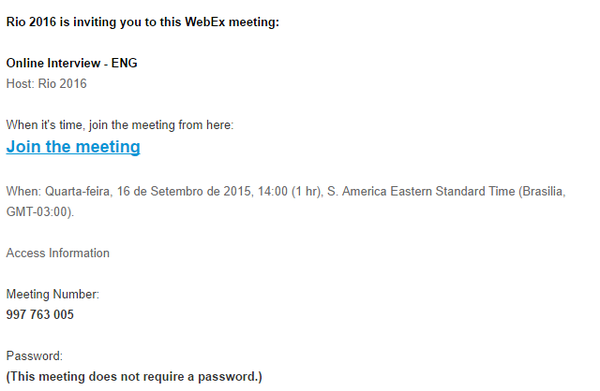 Главным сюрпризом было то, что языком собеседования был английский, а не португальский, как заявлялось вначале. Собственно, от волнения мой средний уровень плавно перекатился в т.н. "базовый-нулевой". Я путал все, что было можно, проклинал все на свете за свои ошибки и уже даже не надеялся попасть на Олимпиаду. На интервью женщина разговаривала с каждым из нас, показывала видео, давала задания, из которых, опять-же, особо запомнилось то, на котором нужно было придумать и сказать главную составляющую Игр.