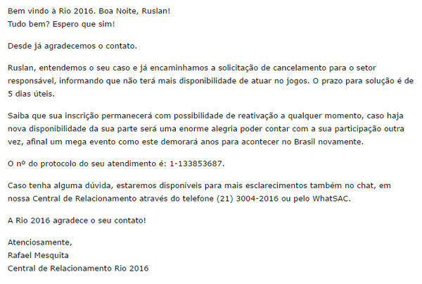 Я был в шоке, и очень рад данному событию. И даже поехал бы... Но в конце июня появилась новость, что нашу команду легкоатлетов сняли. А еще раньше прошел слух о том, что сняли всю команду, и поэтому я написал им письмо, суть которого сводилась к "Нет русских спортсменов - нет русских волонтеров". По той же причине я отказался и от Паралимпиады. Мне жаль, что я написал письма в том тоне, в котором написал, поэтому пруфа не будет. Будет лишь пруф принятия заявки на отказ: