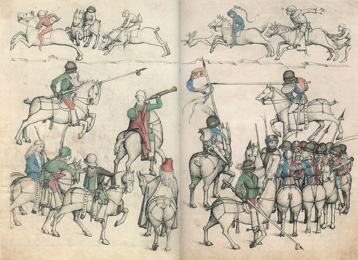 Да примерно то же самое. Жюст (та самая сшибка на копьях, как на картинке), бои разным оружием, как конными так и пешими, как один на один, так и в составе групп.