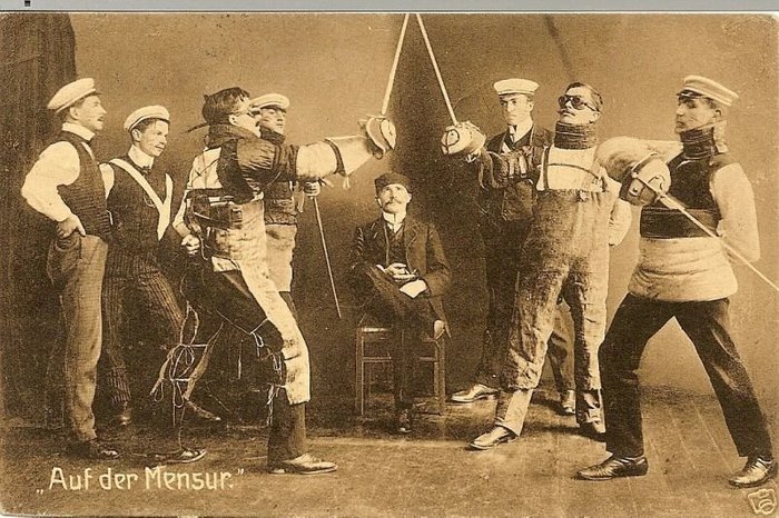 Где-то здесь же затесалось мензурное фехтование. Как писал выше, шпаги и рапиры тогда уже были не особенно в ходу, фехтование как боевое искусство приходило в упадок. Но "мензура" сохранилась ещё с 16 века, потому что спортом, в полном понимании этого слова - не была.