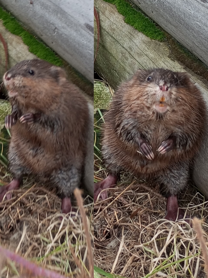 Ондатра вышла к нам на берег, чтобы познакомиться и попрошайничать еду.Этот зверёк был очень смелым, знаю что нельзя кормить представителей дикой природы, но увы...