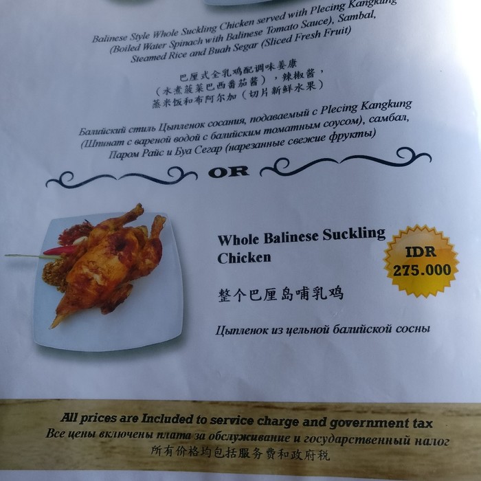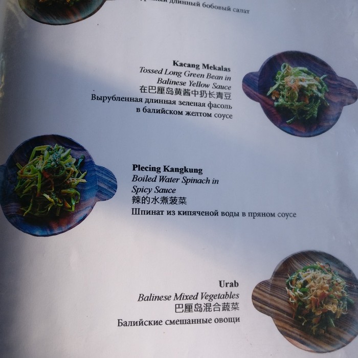 Поездка на Бали мне запомнилась не только красочными морскими пейзажами, но и меню в кафе. Большой поток русскоязычных туристов вынуждает балийцев переводить меню через сомнительные онлайн-переводчики и петь русские песни по вечерам. Кстати, блюда очень вкусные)))