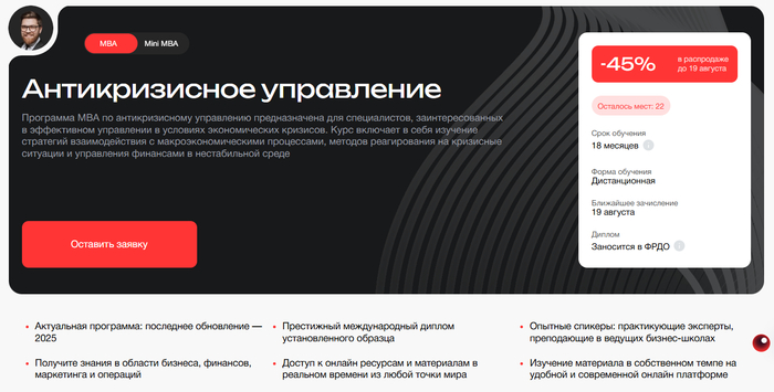 Антикризисное управление от MBA — выдача международного диплома по окончании.