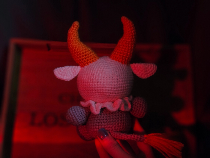 Чуть позже, разглядывая готовую игрушку, меня осенило! Я забыла связать ему еще и воротник! Доделав полностью Бафомета-Пеннивайза, я наконец выдохнула. А я ведь думала, что самое сложное в нем, это вышить красные линии, а как оказалось — не забыть связать деталь😅