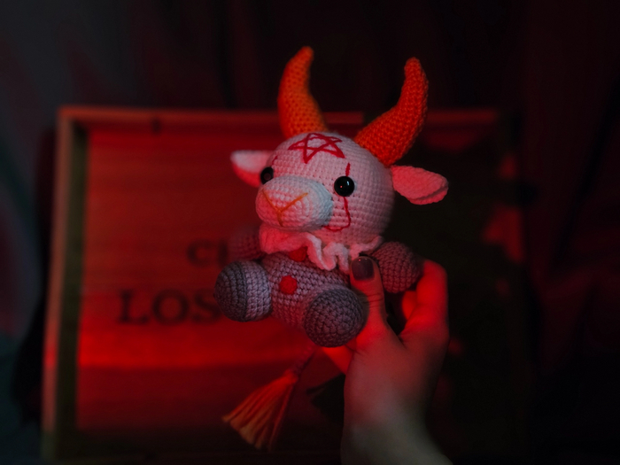 Как многие знают, я люблю вязать наши игрушки в нестандартных оттенках. Больше всего в этом плане "страдает" Бафомет. Я уже вязала его не в классическом черном цвете, а серо-розовым и бело-красным. Полтора года назад мы даже затеяли авантюру с коллекцией бафометов со знаками зодиаков.