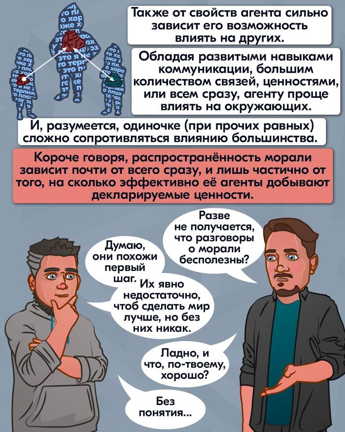 Логично отметить, что создание сверхприродных средств существования посредством труда является главной сущностью человека, поэтому, с точки зрения марксистской теории, создание виртуальной вселенной является тем, что, наоборот, раскрывает и обогащает сущность человека, поскольку на протяжении истории человечества люди всегда пытались сотворить собственную, универсальную действительность, а создание второй «природы» является действительным выражением его сущности. Тем не менее, я должен раскрыть существенную разницу между тем, что является виртуальностью как отдельно взятым явлением, и то, как она влияет на взаимодействие человека с самой действительностью, какие отношения она создает и может создать в процессе погружения в нее. В сущностном свойстве такая форма бытия не несет за собой никаких негативных посылок: без человека она пуста, не существует. Но при вступлении человека во взаимодействие возникает противоречие. Человек оказывается настолько вовлеченным в свою созданную им самим оболочку, которая базируется на высоких технологиях и программах, что истинное познание самого себя, за что и отвечает субъективное, становится невозможным ввиду того, что человек не вступает во взаимодействие с миром. Если раньше субъективность формировалась через личный опыт, то в XXI веке роль алгоритмов и программ в ее развитии становится заметно сильнее. Программа может анализировать предпочтения, влиять на них, а также создавать новые потребности, ранее не существовавших. Все эти факторы ставят под сомнение факт наличия свободы воли в подобном пространстве, так как человек в таком случае теряет свою автономность.