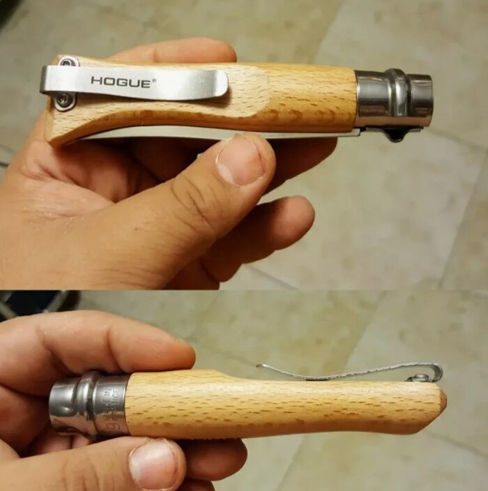 Конечно, у меня с собой всегда есть нож - в качестве повседневного ножа я ношу углеродный Опинель 10 с модифицированной рукоятью (удалённый верхний рог, снятое с рукояти лакокрасочное покрытие, нанесённая выжигателем на рукоять структура и увеличенная выемка для открытия лезвия плюс пропитка льняным маслом). Дополнительно я немного переделал механизм фиксации лезвия в открытом виде, так как стандартная не позволяла использовать этот нож для тычковых ударов, лезвие могло сложится и поранить руку. Поэтому я немного удлинил отверстие в лезвии и проточил выемку вглубь в рукояти - при разложенном ноже лезвие тыльной стороной дополнительно утапливается в рукояти и не складывается при тычковом ударе.