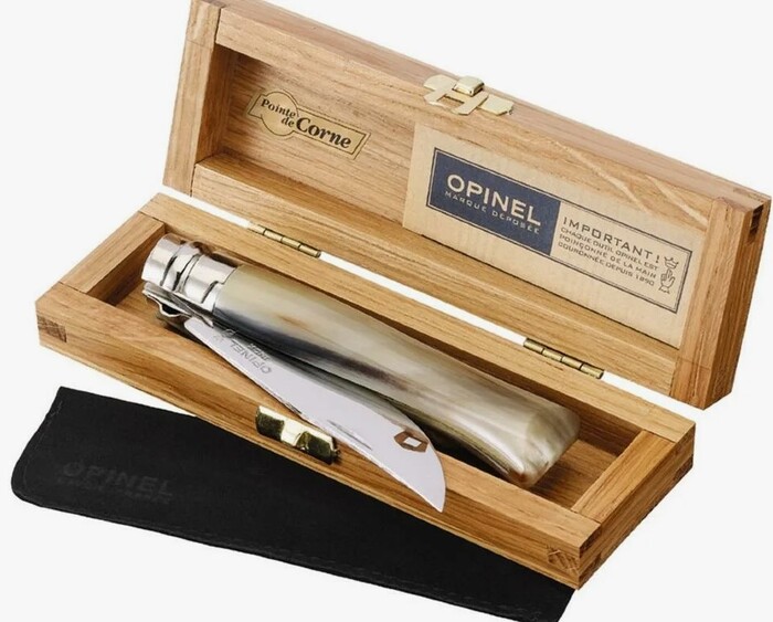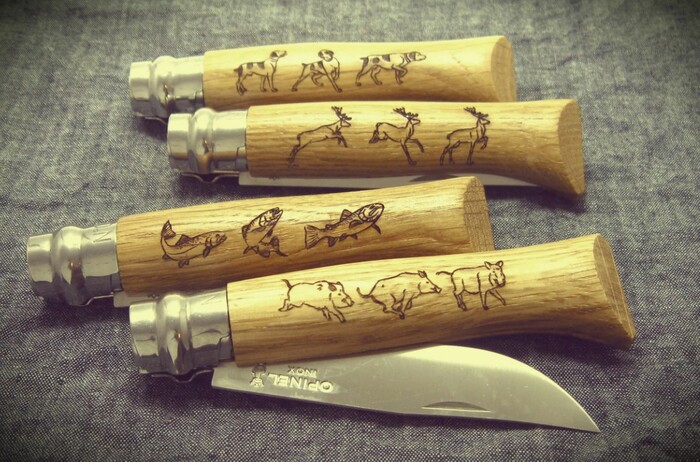 Мы умолчим о сотнях Опинелей ограниченных серий - с рукоятками из самшита, зебрано, бубинго, рога, оливы. с рисунками на охотничью и рыбацкую тематику, с резными узорами - несть им числа.