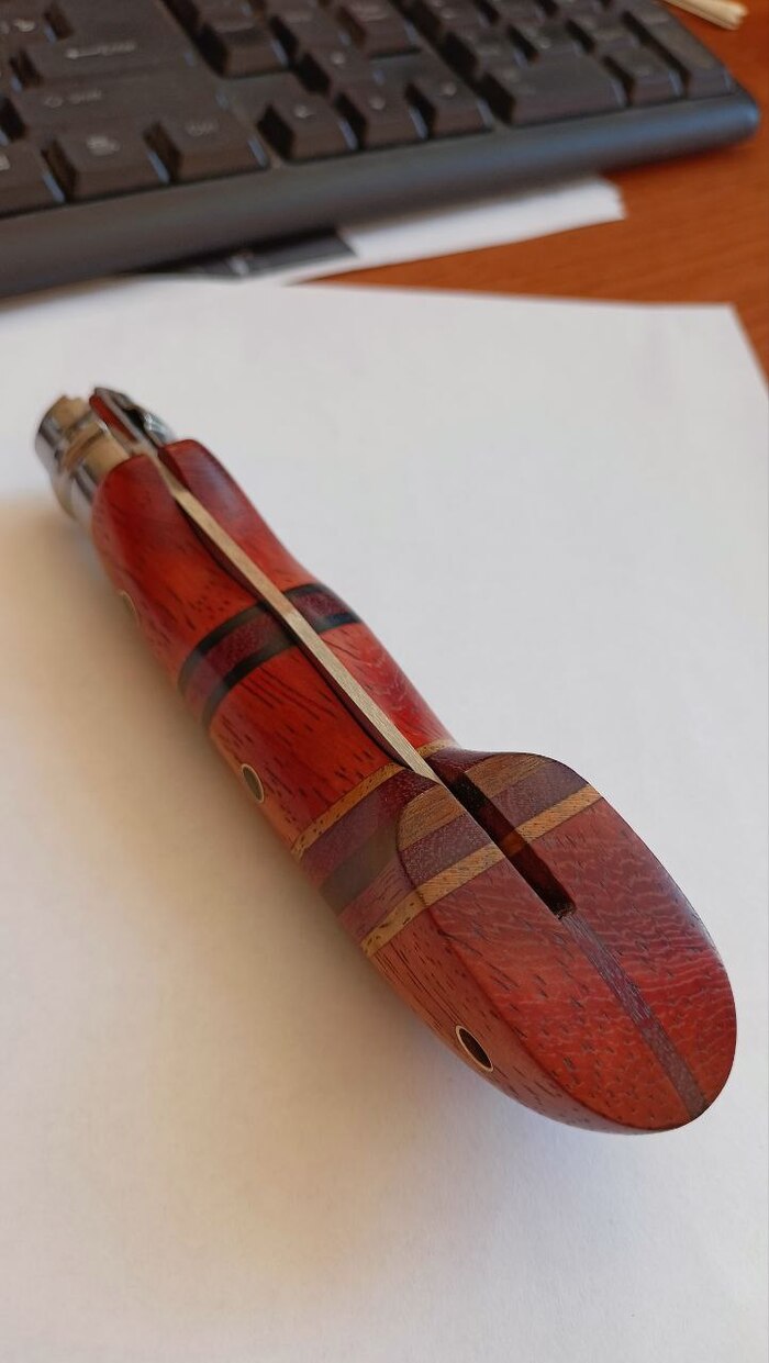 На рукоять пошла деревяшка Зебрано, оранжевая линейка (вот прям самая обычная полупрозрачная линейка в 25 см длиной) и кусочек замши от старой женской жилетки (на проставки между линейкой и деревяхой);
