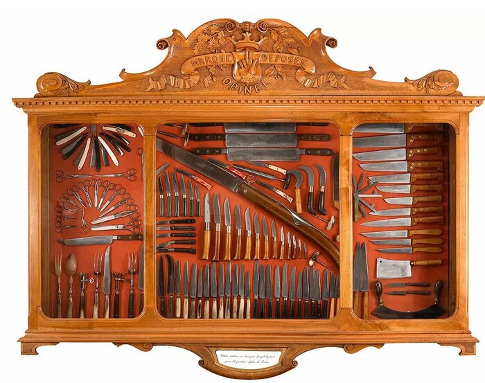 На выставку он прибыл с резной витриной, в которой выставлялись все ножи, выпускавшиеся его фабрикой. До сих пор она занимает почётное место в Музее Опинеля.