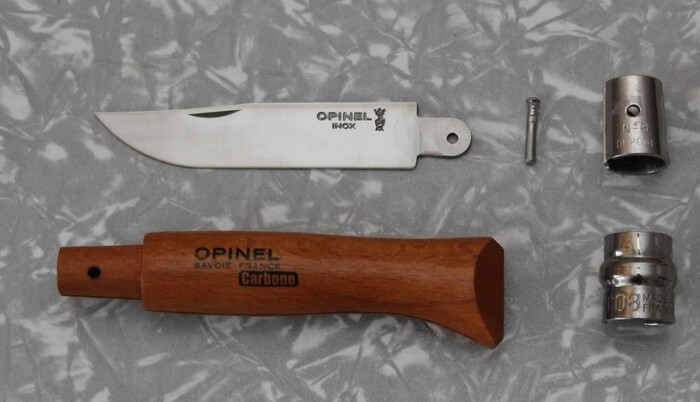 Как видим, ножи по конструкции очень простые - деревянная ручка, металлическая втулка, заклёпка и клинок. Всё. Ровно четыре детали. Недостаток в том, что клинок удерживается сугубо на трении, зато цена с лихвой покрывает его. Во Франции говорили. что Опинель дешевле круассана.