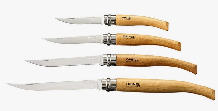 Вообще, линейка Опинелей весьма разнообразная. Основные ножи традиционной формы делаются с рукоятками из бука и с клинками из углеродистой и нержавеющей стали.