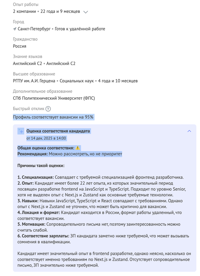 Подходит на 95%, но из-за того, что нет письма и просит ЗП ниже — не рекомендуем. Не приоритет. Есть 800 других, попробуй там.