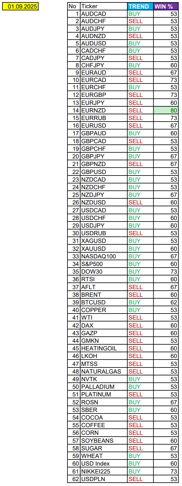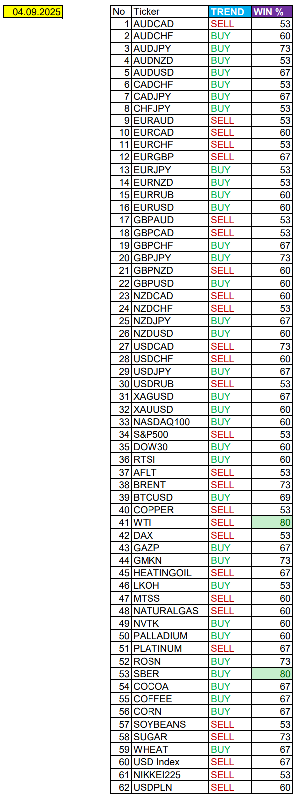 Весь перечень анализируемых активов указан ниже в общем количестве 62 инструмента. Здесь Вы найдете активы рынка Форекс, популярные активы Московской биржи, не менее популярные активы Чикагской биржи СМЕ и мажор криптовалютного сегмента - Биткоин, за которым следуют все альткоины.