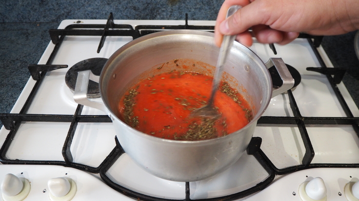 Разогрейте сковороду и обжарьте на сливочном масле мелко нарезанный белый лук, немного карамелизируйте. Затем добавьте пассату и тушите, на среднем огне (5 из 10), пока большая часть жидкости не выкипит, 5-7 минут. Посыпьте листьями орегано и дайте остыть.