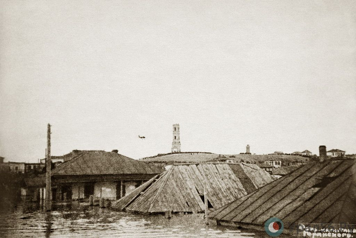 Наводнение 1928 года. На заднем плане - Михайло-Архангельский храм, разрушенный спустя 5 лет