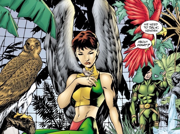 Впрочем, разговор с Орлицей не клеится. Она не намерена раскрывать всю подноготную, и вообще, она даже и не планировала становиться супергероиней – её дед, Сайрил «Ловкач» Сандерс, уболтал (кстати, персонаж очень старый, его приключения начались в 1937 году – до появления Супермэна и Бэтмэна). Кендра не хочет быть супергероиней, не хочет быть Орлицей, а больше всего не хочет быть Шайерой, супругой Хоукмэна – и злится от наплыва чужих воспоминаний и чужой влюблённости.