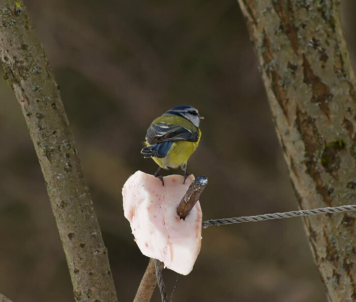 В связи с некоторым похолоданием решил угостить птах салом. Это вызвало небольшой ажиотаж. Даже гренадёрка опять объявилась. Но мороз оказался не столь сильным и хохлатая синица решила спрятаться при моём появлении. Так что сфотографироваться согласилась только лазоревка.