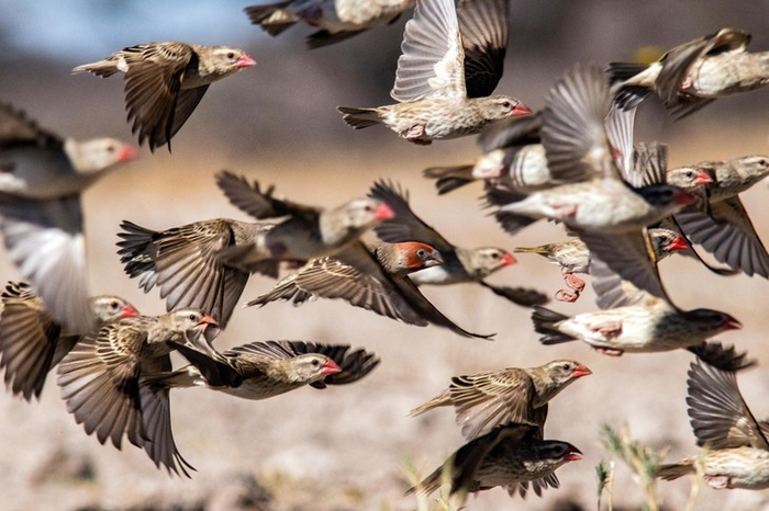 Стая красноклювых ткачей в заповеднике Онгума в Намибии (Южная Африка)