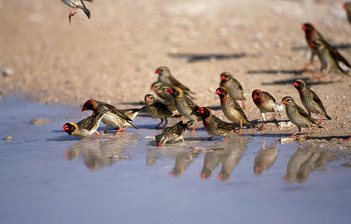Красноклювые ткачи утоляют жажду в пруду, Намибия