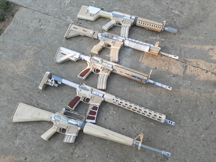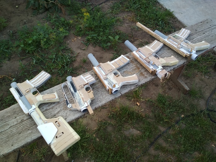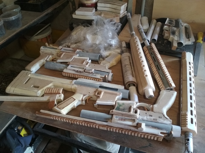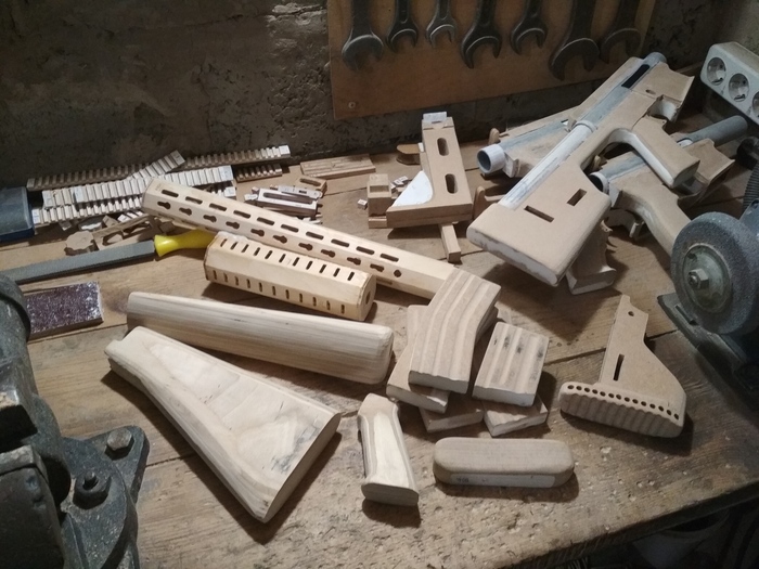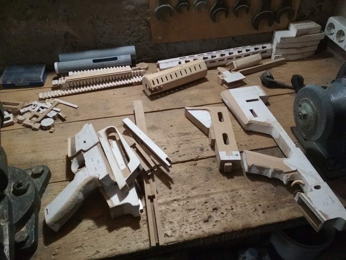 2 дня у меня ушло на выпиливание всех деревянных частей. Больше всего времени заняла сборка пушек - склеивание слоёв (делаю это при помощи столярного ПВА клея, кстати), убирание перепадов в процессе сборки в тех местах, где должны быть механизмы. У макетов, к слову, нажимаются имитации спусковых крючков, имеются защёлки для вынимаемых магазинов, двигаются затворы. У HK416 и LR-300 ещё складываются приклады. Всё из подручных средств, как видите.