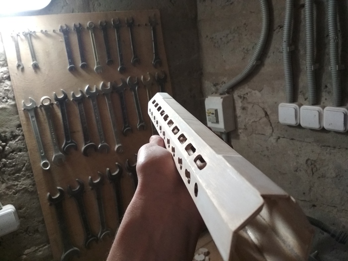 Отдельного внимания стоят цевья у AR-15 Sport (незнаю, на самом ли деле оригинал этой винтовки является спортивным кастомом, но как будто является, поэтому и называю так) и Карабина стрелка. Они представляют собой многоугольники, которые пришлось склеивать из нескольких полос фанеры.