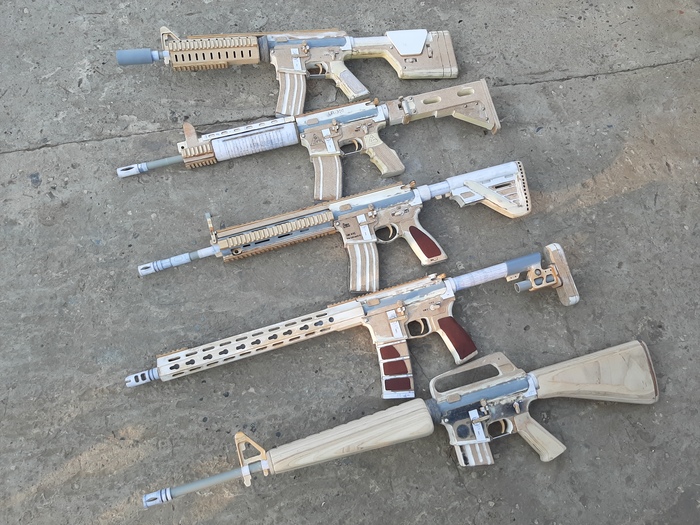 Всем привет! Сегодня расскажу, как летом 2022 года устроил себе встряску, так сказать, челлендж:). За 30 дней по подготовленным заранее шаблонам нужно было сделать 5 макетов оружия из дерева, а именно - моделей на базе AR-15.