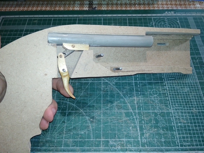 УСМ ладно, его ещё надо было синхронизировать с подачей шелла (гильзы с пулькой) при помощи лотка и выбросом гильзы после отодвигания помпы в заднее положение. Было очень сложно, детали переделывались, отверстия заделывались и сверлились заново уже в правильных местах. В конце концов более менее адекватного результата удалось достичь.