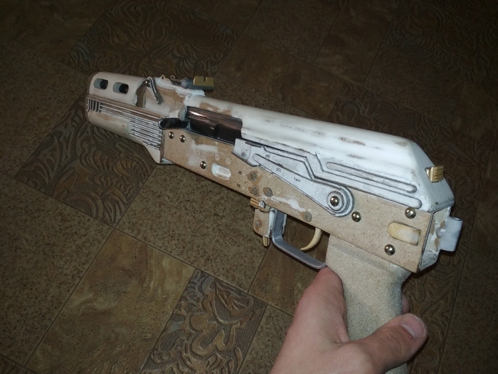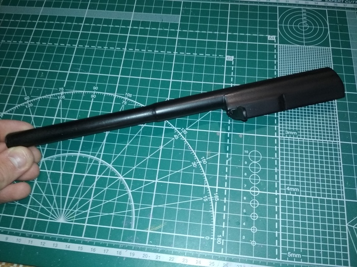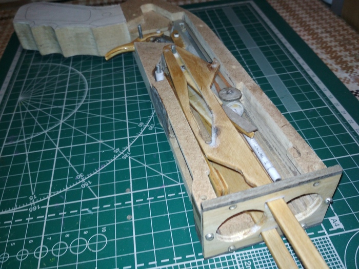 Немного про разборку макета. Было решено сделать крышку из правой стенки корпуса, поскольку это самый удобный вариант - открутил и сразу есть доступ к механизмам, ну а несколько винтов общий вид не портят, на мой взгляд. Ещё есть передняя крышка с отверстиями под ствол и трубчатый магазин.