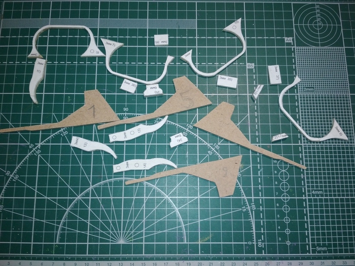 Для создания я использовал фанеру, МДФ, бумагу, картон, пластик и немножко металла. Первым делом перенёс выкройки на материал и вырезал лобзиком.