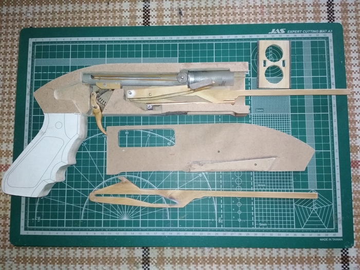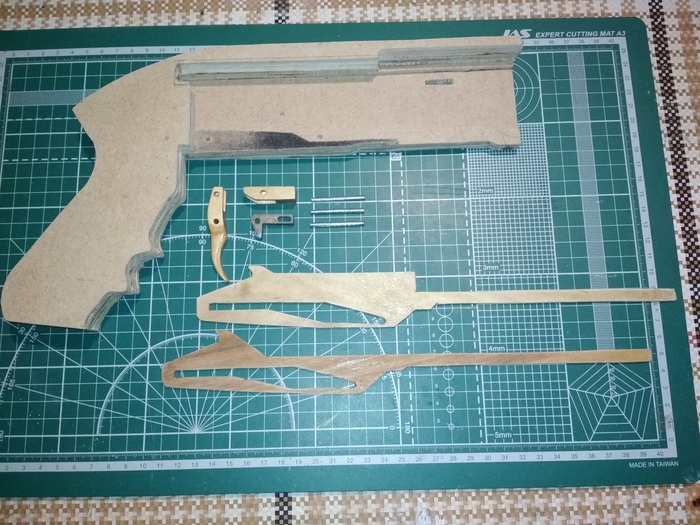 Затем начался процесс склеивания слоёв составляющих деревянного дробовика. Принцип простой и его можно описать одним словом "бутерброд". В этом деле мне всегда помогает столярный ПВА, а также цианокрилат (суперклей). Без последнего данная работа практически лишена смысла, поскольку суперклей с высокой адгезией (например Akfix 702) очень хорошо пропитывает и укрепляет детали, что в этом проекте крайне важно.