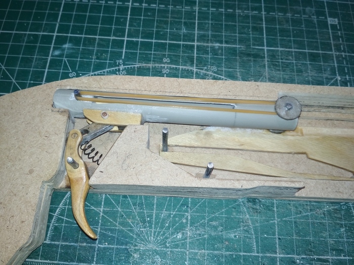 Итак, про Ударно-спусковой механизм. При нажатии на спуск, вниз опускается фиксатор ударника (серая деталь из картона между крючком и трубкой), тем самым больше не препятствуя самому ударнику, который стремительно возвращается на место 2 резинками. Сам ударник представляет собой длинный металлический штифт (позже купил карбоновую палочку и сделал из неё. Она легче и прочнее, и почему-то давала шарику бОльший импульс при столкновении, т.е пулька летела дальше)