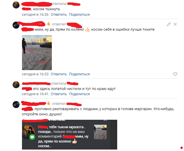 Иной раз беру инициативу в руки и разгребаю снег, чего не делают коммунальщики. Сижу, значит, в паблике, вижу, что беременяшка жалуется на обилие снега под ногами, пытаюсь выяснить, где же она нашла то кашу "по колено", дабы помочь ей, чтобы в следующий раз она с комфортом дошла куда ей нужно, но... Неужели нельзя по-человечески общаться, эх!