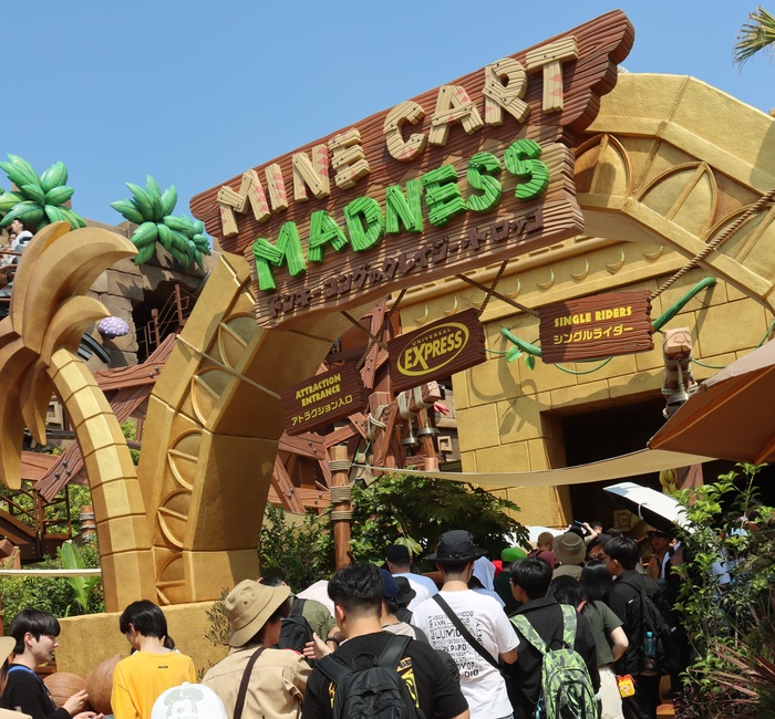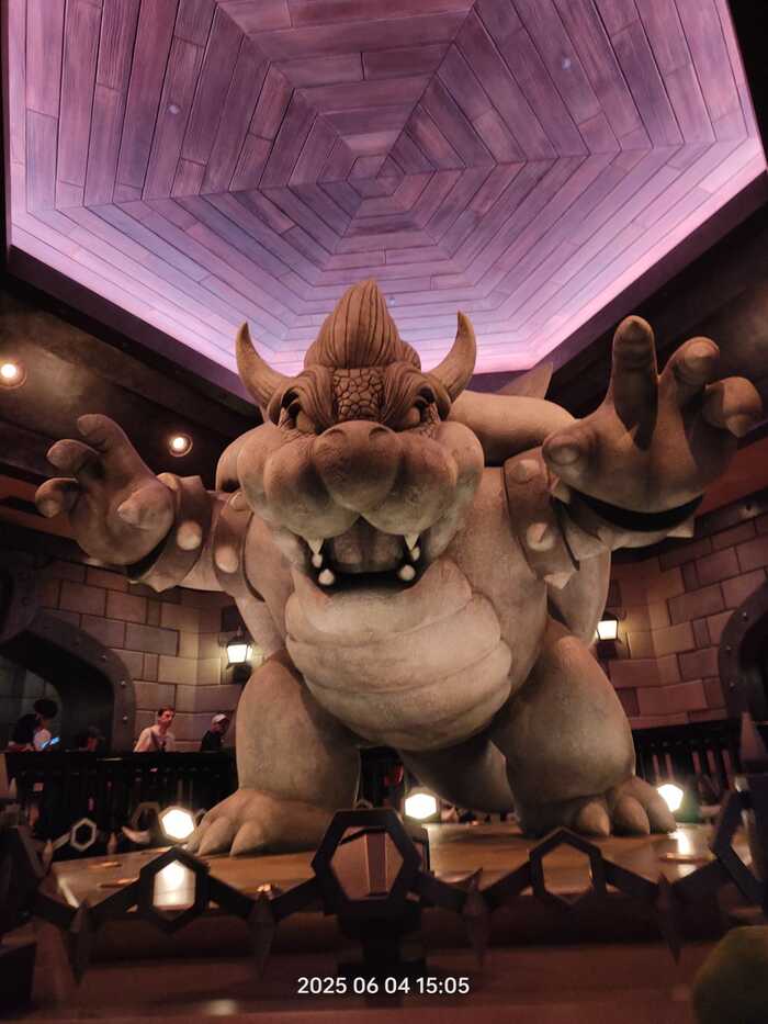 и отведать мороженое DK) мы его взяли с мерч кружкой DK, ценик в районе 2000 йен, без кружки дешевле, чуть купили мерча детям (шапки и ободки) и пошли на выход. В районе 14:00 +- мы вышли из Nintendo world и на вход в него стояла огромная очередь, минут на 30 точно, чтобы зайти в зону Nintendo world, поэтому рекомендую сделать это в первую очередь. Затем мы пошли на JAWS (челюсти), так как на следующий день этот аттракцион должны были закрыть на ремонт (о таком пишут в новостях в приложении), там была очередь минут 60. Аттракцион представляет собой поездку на лодке со спецэффектами, младшая испугалась, было опять очень интересно рекомендую. Затем мы пошли в зону Юрасик парк, там полет птеродактиля один из самых мощных аттракционов в парке всем советую!!! Там мы простояли 2 часа, так как несколько раз аттракцион закрывали на тесты. Младшая туда не попала там нужен рост 132 см, да и она не хотела, он страшноват, поэтому она ждала нас рядом со шкафчиками. После аттракциона меня укачало, но я держался) супругу тоже чуть укачало, а затем мы пошли в зону Миньонов на аттракцион «Гадкий Я»,