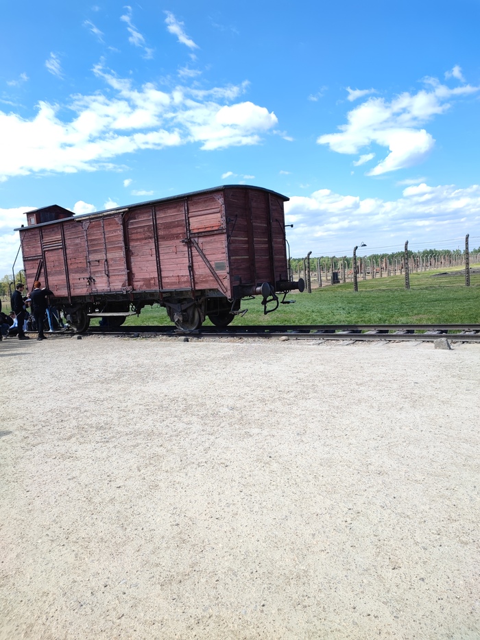 Здесь стоит вагон как демонстрация того, на чем сюда доставляли всех заключённых.