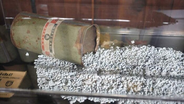 Через отверстие в потолке в камеру подавался газ Циклон Б. По иронии судьбы, этот пестицид, изначально созданный для борьбы с вредителями, изобрел еврей Фриц Габер, некоторые родственники которого в последствии погибли в лагерях смерти от этого самого газа... Несколько фирм до сих пор производят Циклон Б под другим названием.
