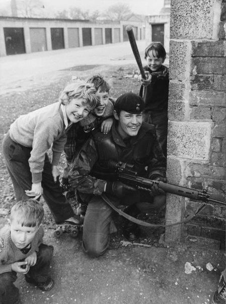Британский солдат фотографируется с детьми во время патрулирования. Белфаст. Май 1981 года.
