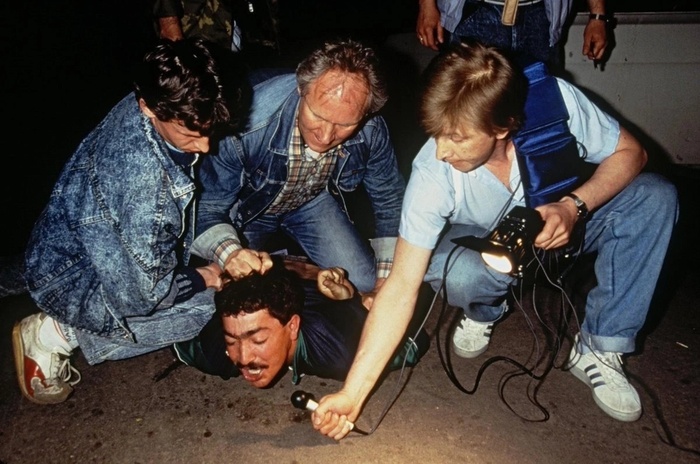 Репортер пытается взять интервью у задержанного члена этнической мафии. Москва, октябрь 1991 г.