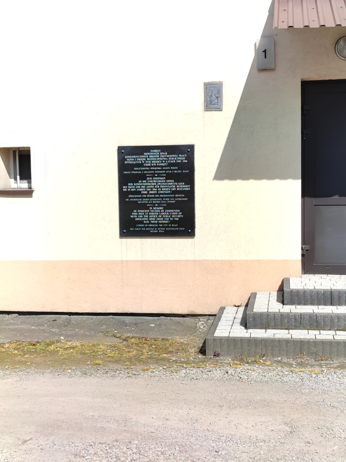 Мемориал посвящается памяти невинных жертв коммунистических лагерей принудительного труда НКВД и комитета государственной безопасности, которые существовали в этом месте в 1945-1946 гг.