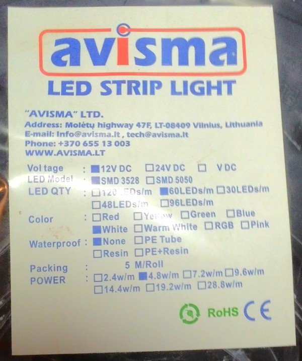 Достались они тоже на халяву, ну почти(3 бутылки пива). В этом подсобил друг. Он к стати, тоже пикабушник, работает в рекламном отделе вот и подогнал несколько кусков очень неплохой ленты. В упаковке 2 вида ленты, 1,5 м на 4,8 ватта и 2,10 +- на 8 ватт, если не ошибаюсь.