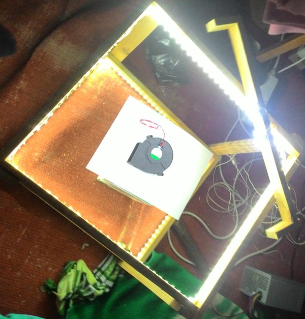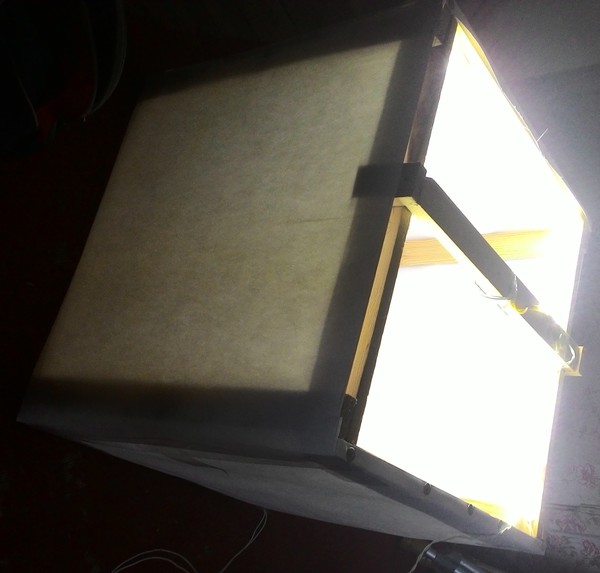 Планка с верху служит для прямого освещения изделия и уничтожения теней. На ней установлено 2 лед модуля по 4 диода в каждом. Так же чтобы еще больше избавиться от теней было принято решение закрыть стенки ватманом, который стоял за шкафом еще со времен школы. В итоге получилось следующее: