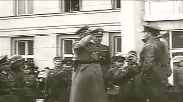 Но давайте себе представим, что СССР бы не стал вводить войска в Польшу. Очевидно, немцы быстро дошли бы до ее восточной границы. Фактически, тот же Брест (который к востоку от линии Керзона, то есть отжатый поляками в 1920-м) они уже успели взять. Советские войска вернули контроль над городом, а немцы, построившись в колонны, торжественно вышли. Этот факт "сдачи-приемки Бреста" либералы называют не иначе как: "СССР и Германия проводили совместные парады". Фото ниже.
