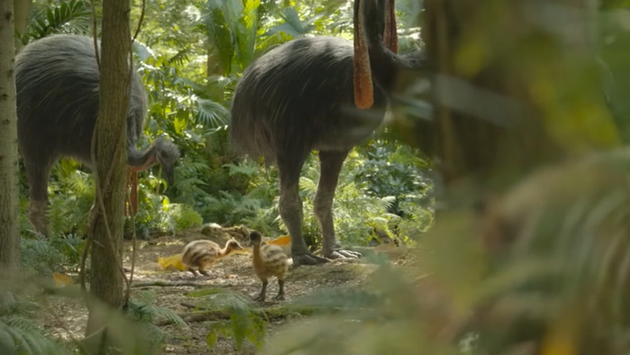 На этом кадре из недавнего третьего сезона сериала "Доисторическая планета" моа и видны. Это не разные виды - просто названные птички относятся к той когорте созданий, у которых половой диморфизм крайне заметен - мощные и полные самки больше и тяжелее стеснительных самцов в разы. Самцы же единолично высиживали яйца в наземных гнёздах, пока матери уклонялись от птичьих алиментов.