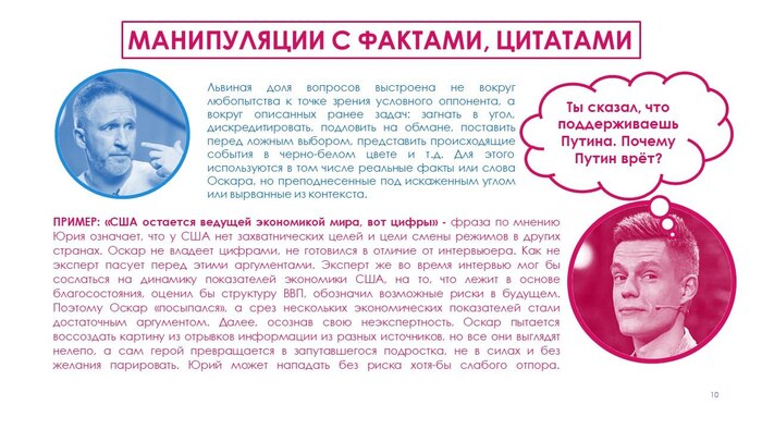 Не скажу, что я прям хорошо знаю матчасть, но тут, конечно было то еще пиршество инфантилизма и зашоренности. Тут были и перебивания с передергиванием (вроде обвинения Стрелкова в развязывании гражданской войны), и ироничные замечания по поводу позиции гостя, как бы незаметно выводящие из области серьезности (в эти ворота начинает играть уже превью-безумноватый взгляд гостя и утомленный фейспалм хозяина-мол, что ты несешь, болезный), и классическое натягивание совы на глобус (сравнение с Германией 30-х и вспоминание зигующего Рогозина), и жонглирование понятиями (ты вот тут Путина 3 часа выгораживаешь), и откровенные глупости какие-то (про то как можно поддерживать армию и осуждать войну, про «цивилизованные» государства, которые не лезут в чужие дела), в общем много еще всякого нелепого (с обеих сторон)…