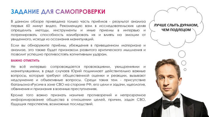 Все, в прочем, как всегда-манипуляция чистой воды и высшей пробы (еще раз аплодирую). Начиная с выбора гостя. Ведь будь на месте Оскара Кучеры кто-то иной, более погруженный в контекст, то Юрий, при всех его достоинствах, просто не вывез бы. Ну вот никак. Ведь одно дело поддакивать Полозковой в ее рассказах за все хорошее, а другое дело нести эту пургу той же Долгаревой, которая может и, пардон, по едалу дать за такое. Но Юра так не сделает (разве только ради специфического хайпа, вроде образа мученика), не будет на месте Кучеры кого-нибудь вроде Пегова или Стешина, Джанго или Чичериной, Прилепина или Проханова, Пучкова или Норина - не будет. И не потому что им западло (а это может и так), а потому, прежде всего, что Юра будет мандражировать. При всем уважении. Ведь были же у него Лимонов и Киселев, Доренко был (еще по любому кто-то), где Юрины приемы не проканали-жалко выглядело. А этого пипл не должен хавать - не для того Юра иноагент (особенно сейчас).